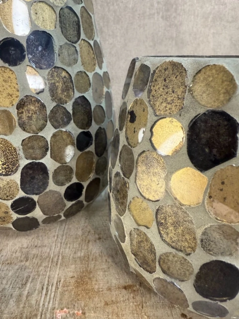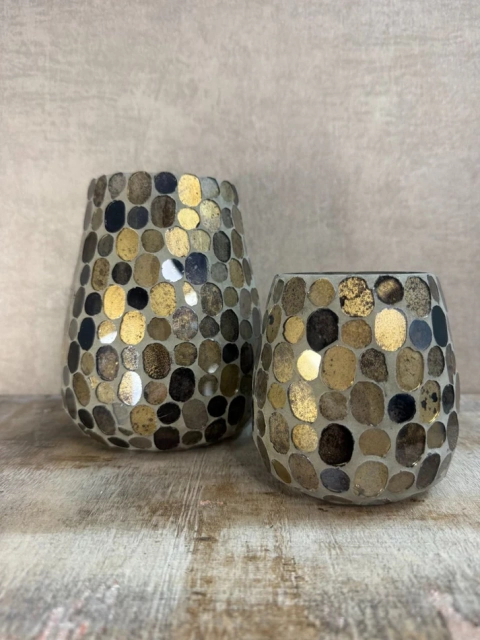 € 7,15Het windlicht stones is een opvallende sfeermaker van glas, versierd met een mozaïek van ronde steentjes in warme bruin-, goud- en zwarttinten.